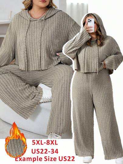 SHEIN CURVE+ 大码女式纯色连帽长袖上衣和裤子休闲两件套,女式休闲抽绳罗纹针织落肩长袖卫衣和裤子两件套,适合日常休闲穿着 - 杏色 - 查看 10