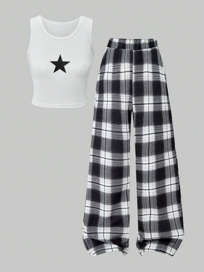 SHEIN ChillGRL 青少年女孩休闲甜美可爱吊带背心和复古格子阔腿裤两件套,适合日常、节日、假日、夏季、旅行 - 黑與白 - 查看 1