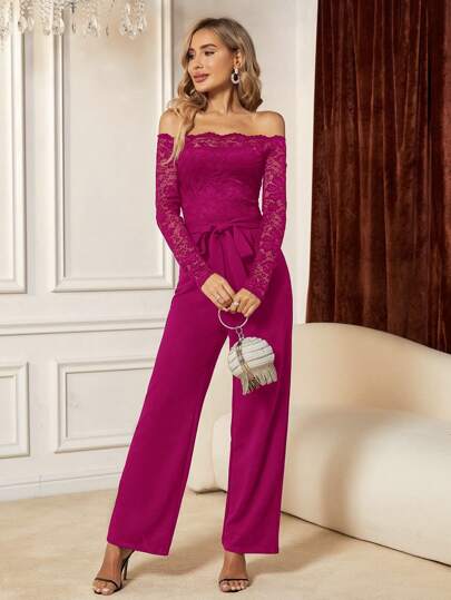 SHEIN Clasi 一字肩上身蕾絲腰帶連身褲 - 中紫紅色 - 查看 1