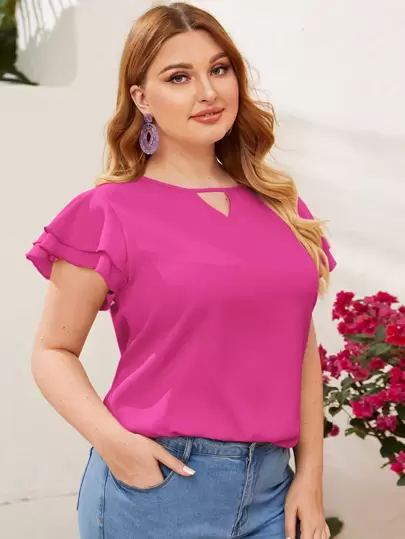SHEIN Clasi 大碼鎖眼領口多層蝴蝶袖上衣 - 玫紅色 - 查看 1