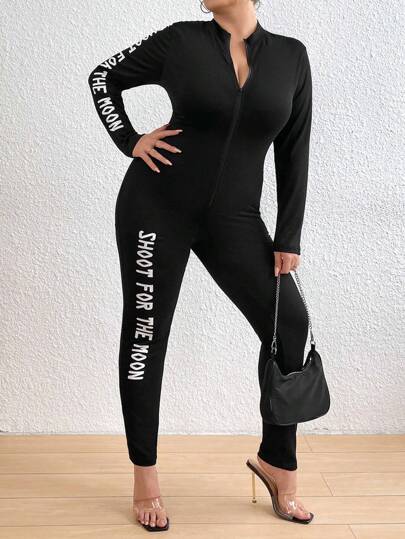 SHEIN Coolane 加大號標語圖形拉鍊連身跳傘服 - 黑色 - 查看 1
