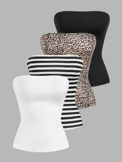 SHEIN EZwear 4入組女式純色印花簡約日常無肩帶上衣 - 彩色 - 查看 1