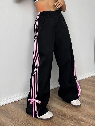 SHEIN EZwear 秋季休闲黑色撞色侧条纹织带工装裤 - 黑色 - 查看 1