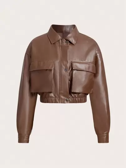 Muchica 翻蓋口袋落肩袖PU皮革夾克 - 棕色 - 查看 1