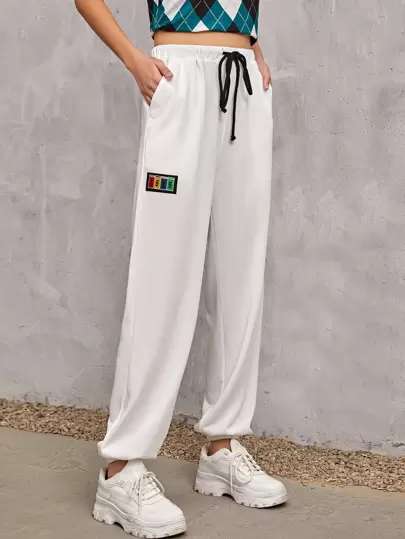 SHEIN EZwear 貼布細節腰部抽繩衛褲 - 白色 - 查看 1
