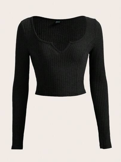 SHEIN EZwear 大碼缺口領短款T恤 - 黑色 - 查看 1