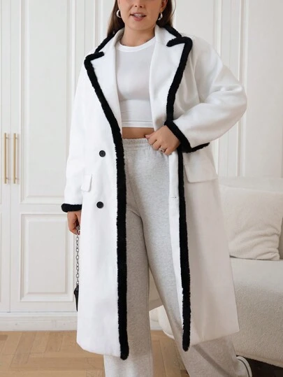 SHEIN EZwear 加大尺碼拼色羊毛大衣,邊緣細節處理 - 黑與白 - 查看 2