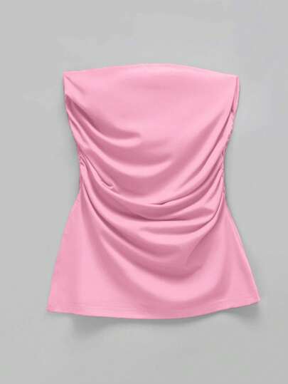 SHEIN EZwear 加大碼褶皺分裂無肩帶針織彈性上衣粉紅色背心上衣 - 粉色 - 查看 1