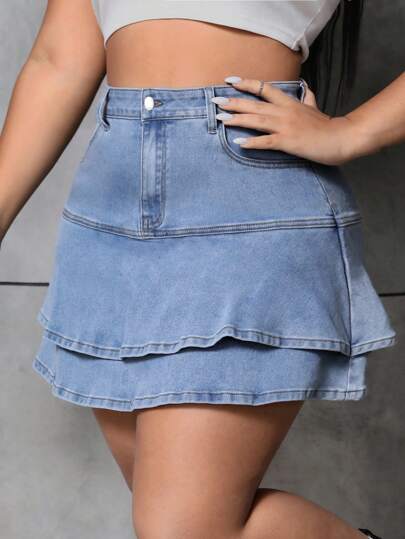 CovetEZ 加大尺寸女士雙層荷葉邊牛仔裙 - 中等水洗藍 - 查看 1