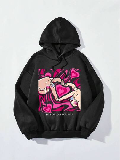 SHEIN EZwear 休閒簡約長袖帽衫,手勢愛心和字母印花設計,適合秋冬季節,女性超大尺碼 - 黑色 - 查看 1