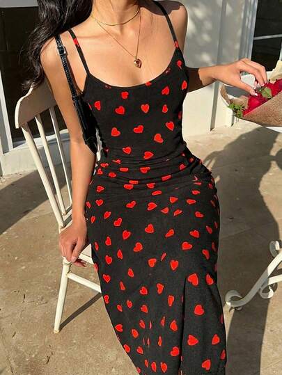 SHEIN EZwear 女士爱心印花中长连衣裙,修身吊带连衣裙,适合夏季穿着 - 彩色 - 查看 1