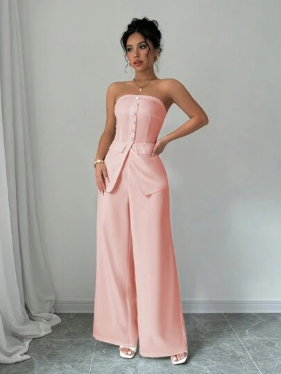 Elenzga 2 件套女士休闲套装 - 抹胸衬衫和裤子套装 - 粉色 - 查看 1