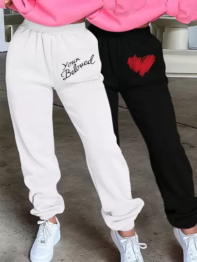 SHEIN Essnce 2 件套心形和涂鸦图案松紧腰带长款运动裤,带保暖内衬,适合情人节和休闲时光 - 彩色 - 查看 2