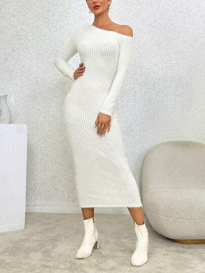 SHEIN Privé 女士不對稱肩一字領連身裙 - 杏色 - 查看 4