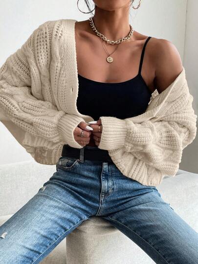 SHEIN Essnce 绞花针织落肩开衫 - 卡其色 - 查看 1