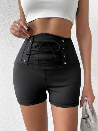 SHEIN Essnce 扣眼前繫帶短褲 - 黑色 - 查看 1
