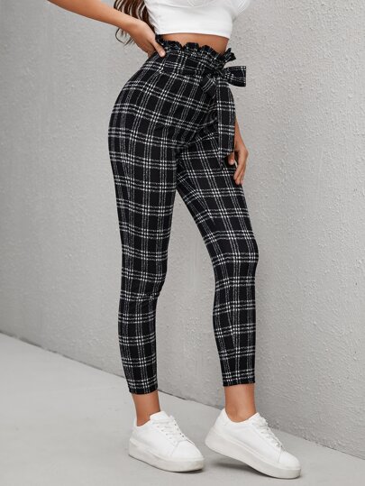 SHEIN Essnce 格紋前打結褶邊長褲 - 黑與白 - 查看 5