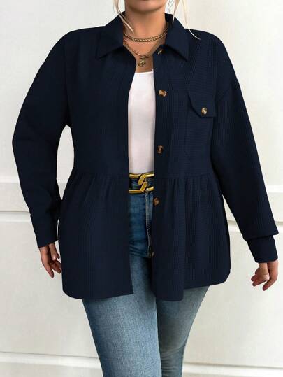 Calvaya 大碼翻蓋口袋落肩袖荷葉邊下擺外套 - 藏蓝色 - 查看 1