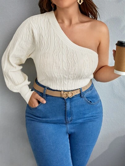SHEIN Essnce 大碼單肩麻花編織套頭毛衣 - 米色 - 查看 1