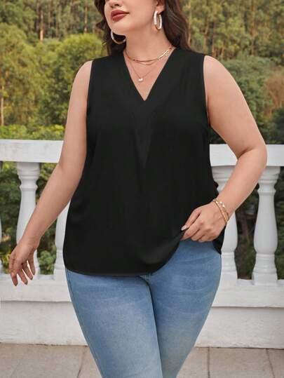 SHEIN Essnce 大碼素色V領襯衫 - 黑色 - 查看 1