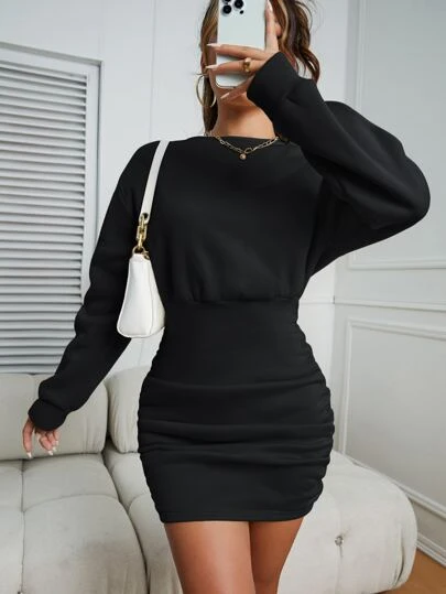 INAWLY 素色褶邊落肩袖衛衣洋裝 - 黑色 - 查看 1