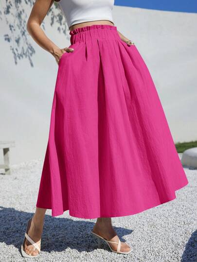 SHEIN Essnce 夏季女装休闲 A 字形亚麻中长裙,适合夏季海滩高腰宽松 - 玫紅色 - 查看 1