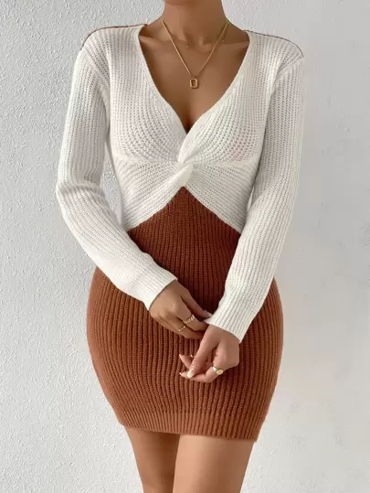 SHEIN Essnce 雙色前扭結毛衣洋裝 - 彩色 - 查看 1