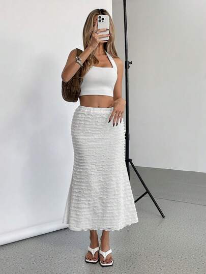 SHEIN Essnce 女士纯色多层荷叶边半身裙 - 白色 - 查看 1