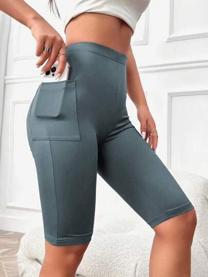 SHEIN Essnce 女款純色短緊身褲(附手機袋) - 青碧色 - 查看 1