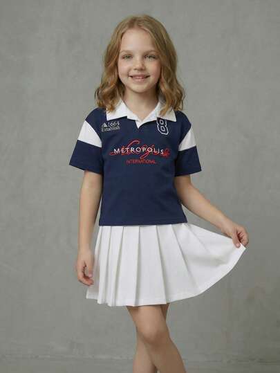 SHEIN Explorewe 两件套女童翻领宽松短袖百褶裙套装,藏蓝色底白色撞色,“METROPOLIS”标语和数字8印花,百褶裙活泼可爱。适合暑期学校活动、主题派对、郊游、打造学院风甜美造型,轻松塑造充满活力、个性十足的小女孩形象。 - 寶藍色 - 查看 2
