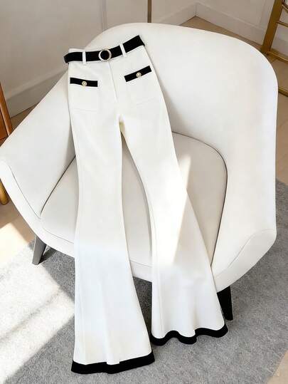 SHEIN Franclia 优雅浪漫的女士喇叭裤(含腰带) - 白色 - 查看 1