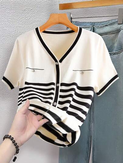 SHEIN Franclia 女士休闲V领短袖条纹针织上衣 - 杏色 - 查看 8