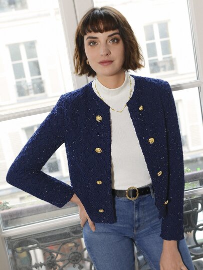 SHEIN Frenchy 女士休闲通勤纽扣装饰圆领夹克,秋季 - 藏蓝色 - 查看 1