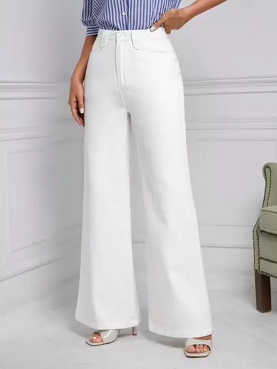 SHEIN Frenchy 高腰闊腿牛仔褲 - 白色 - 查看 1