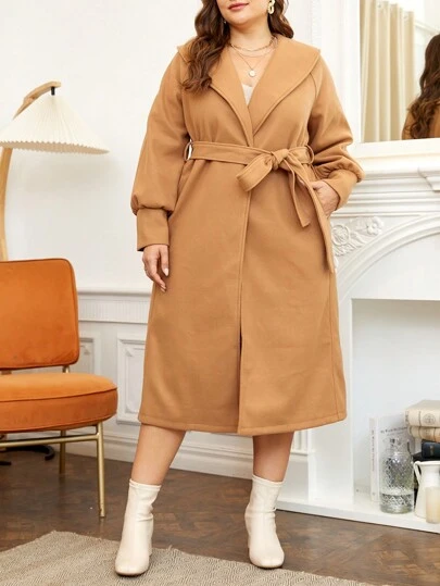 SHEIN Franclia 大碼翻領腰帶花呢外套 - 駝色 - 查看 1