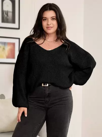 Flirla 大码女式纯色针织V领镂空长袖常规休闲通勤百搭圆领毛衣,秋冬针织套头衫 - 黑色 - 查看 1