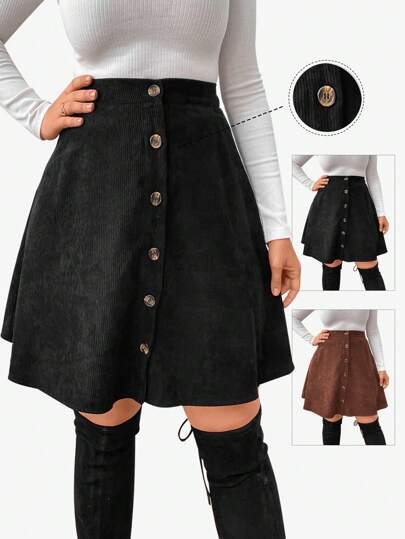 Flirla 大码纯色纽扣装饰裙 - 黑色 - 查看 1