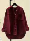 女士灯芯绒衬衫 - 酒红色翻领长袖上衣,100% 涤纶,可机洗,优雅休闲纯色日常穿着,适合所有季节