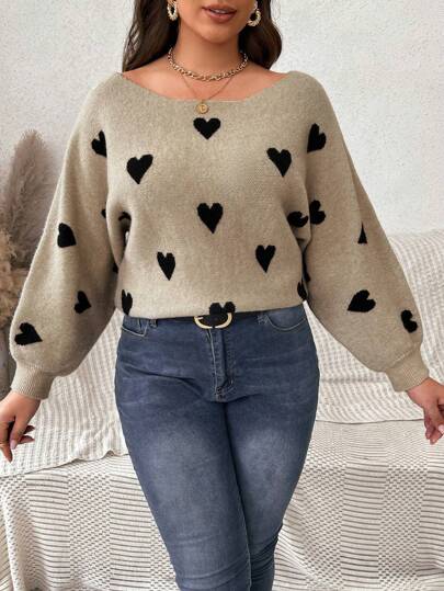 SHEIN Franclia 大尺碼女裝心形圖案蝙蝠袖毛衣 - 杏色 - 查看 1