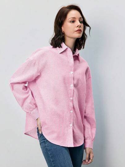 SHEIN Frenchy 條紋印花下垂肩襯衫 - 粉色 - 查看 4