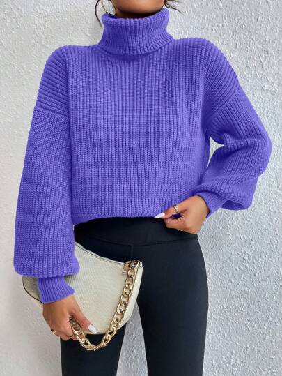 SHEIN LUNE 高领落肩罗纹针织毛衣,长袖套头针织衫,秋冬毛衣 - 紫色 - 查看 1