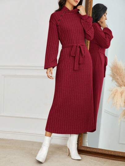 SHEIN Frenchy 女士提花圓肩袖連身裙 - 酒紅色 - 查看 6