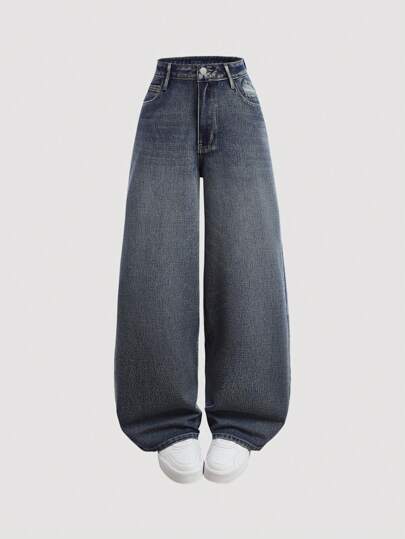 SHEIN Girlism 青少年女孩 Y2K 时尚复古水洗破洞低腰阔腿牛仔裤,带口袋,女孩秋装返校街头装万圣节服装 - 中等水洗藍 - 查看 1