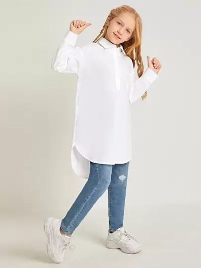 SHEIN 女孩翻領紐扣弧形下擺襯衫 - 白色 - 查看 1