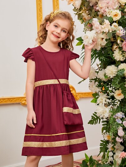 SHEIN 女孩織帶拼接荷葉邊洋裝 - 酒紅色 - 查看 1