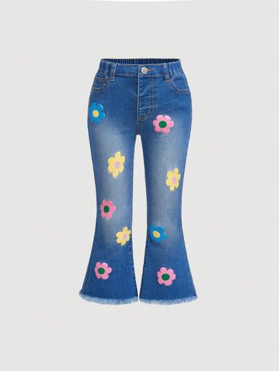 SHEIN 少女花卉印花原始邊緣喇叭褲腳牛仔褲 - 深色水洗藍 - 查看 1