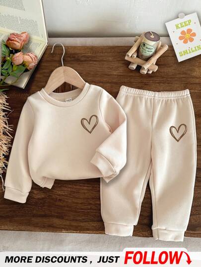 SHEIN 女婴可爱手绘心形图案米色针织柔软套头衫套装,厚款,适合秋冬季 - 米色 - 查看 1