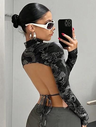 SHEIN ICON 龍圖形高領后空綁帶黑色短袖上衣 - 黑色 - 查看 1