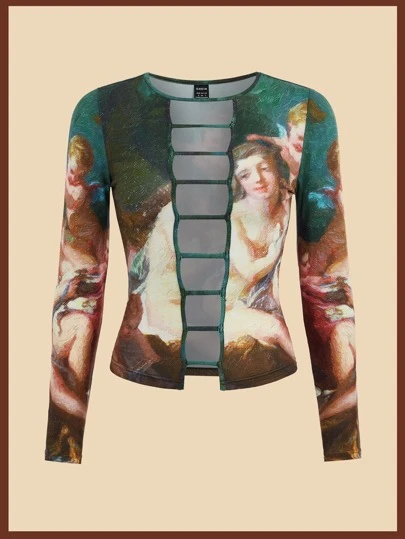 SHEIN ICON 西部風格人像圖案前鏤空短款T恤 - 彩色 - 查看 1