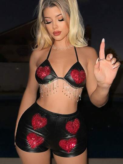 Sweetina 女用閃光心形圖案水鑽流蘇掛脖套裝,打造性感外觀 - 黑色 - 查看 1